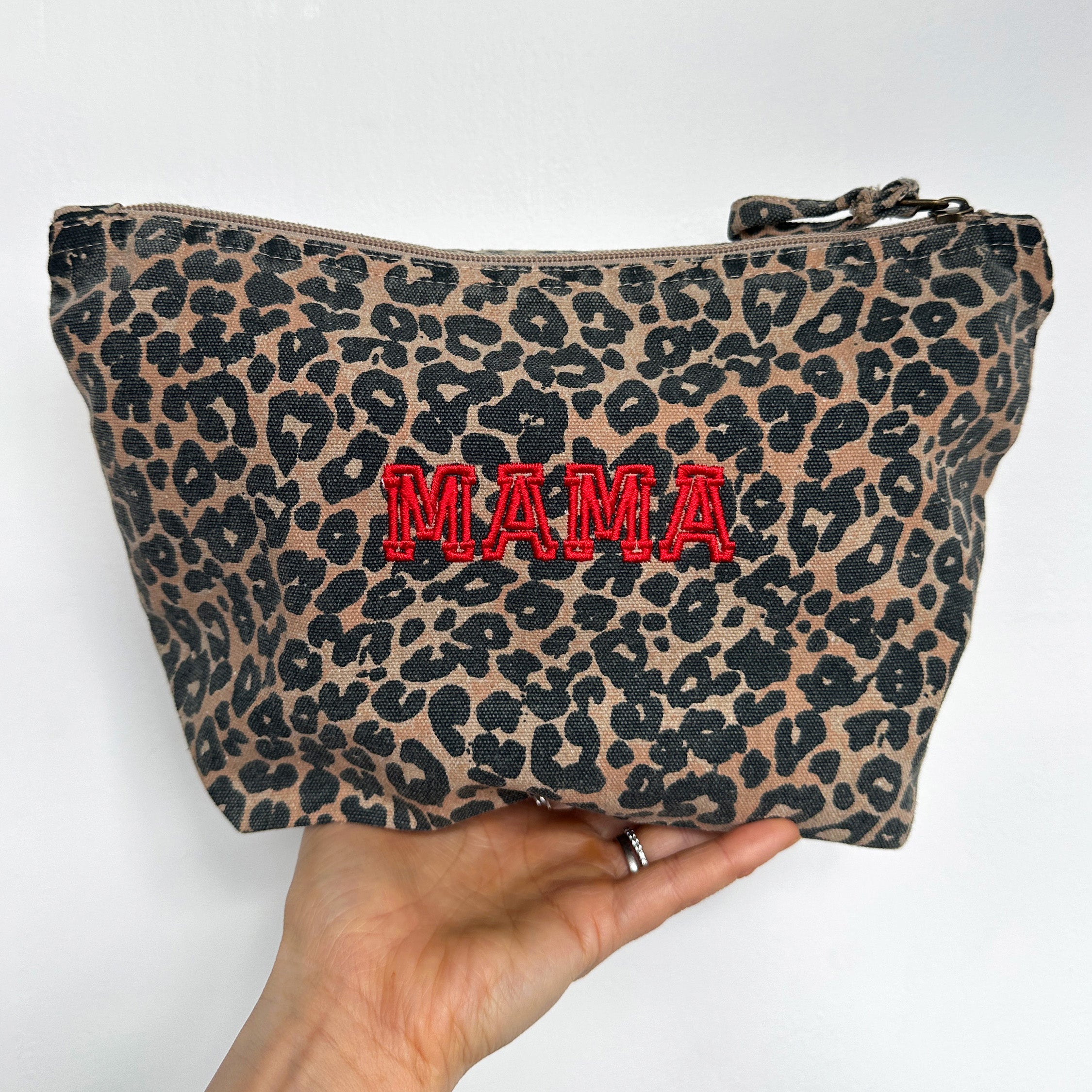 A beautiful personalised washed effect leopard print makeup/wash/travel/organiser bag. The perfect gift for all occasions.Our personalised leopard print canvas makeup bag is a stylish yet practical accessory designed for everyday life. Made from 70% GRS-certified recycled cotton and 30% GRS-certified recycled polyester, this beautiful cosmetic bag features a timeless washed leopard print for a modern, effortless look. Personalise it with a name, initials, “Mum”, “Mama” or a meaningful word, embroidered in your chosen thread colour to create a truly unique gift. Perfect for storing makeup, skincare or travel essentials, fits neatly inside a handbag or suitcase. A thoughtful Mother’s Day gift, birthday present or special treat, made to be loved and used every day.